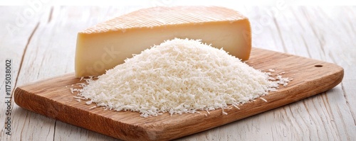Grated Parmesan Cheese on Wooden Cutting Board with Wedge of Parmesan