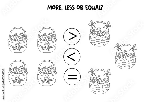 Grater, less or equal with cartoon black and white Easter baskets.