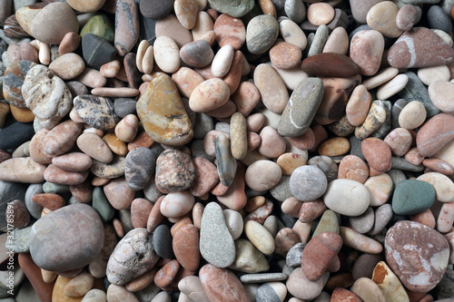 Gravel pattern of colored stones with shell. Abstract nature pebbles background.Small sea stones on the beach, vacation at sea. Top view