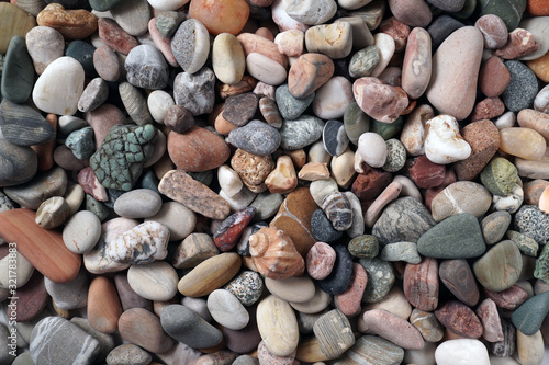 Gravel pattern of colored stones with shell. Abstract nature pebbles background.Small sea stones on the beach, vacation at sea. Top view