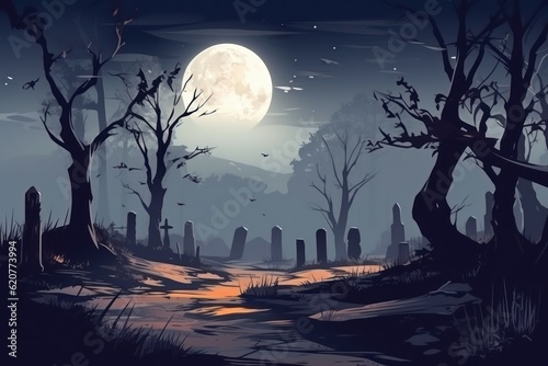 Graveyard in creepy forest in dark night gloomy creepy graves. Generative AI