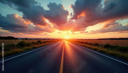 Gray asphalt road with scattered dark clouds at sunrise, shadows, asphaltroad, scatteredclouds