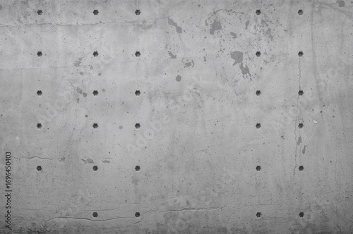 Gray concrete surface featuring various small holes, showcasing a textured and abstract pattern for design and construction backgrounds