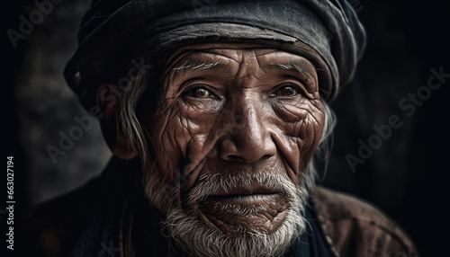 Gray haired senior man in traditional turban looking at camera generated by AI