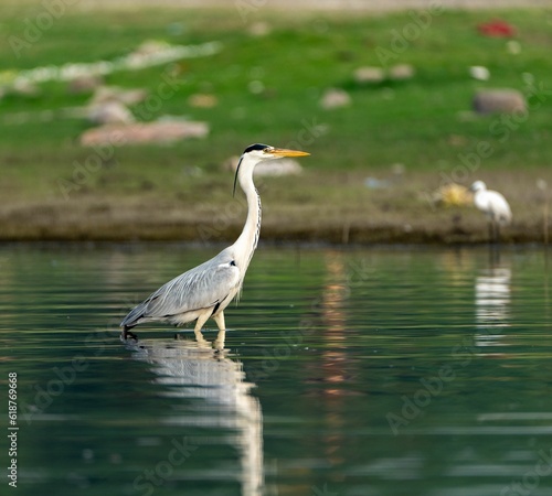 heron, grey, shoreline, lush, green, field, grass, leg, majestic, avian, neck, bird, wildlife, flora, fauna, duck pond, nature, water