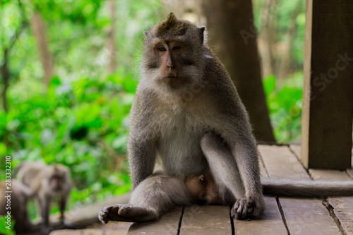 Gray monkey portrait looking at the camera sitting on wooden platform