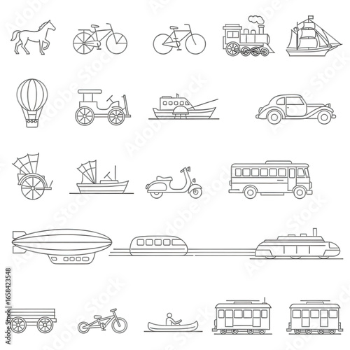 transport, icon, vehicle, greyscale, silhouette, carriage, bicycle, motorcycle, car, boat, ship, airship, bus, train, tram, horse, balloon, monorail, scooter, barge, rickshaw, plane, cart, sailboat, stagecoach, tractor, locomotive, streetcar, coach, machine, vintage, antique, classic, design, illustration, symbol, graphic, outline, vector, drawing, contour, isolated, art, grid, collection, mode