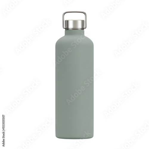 Gray Stainless Steel Water Bottle with Silver Cap on Transparent Background