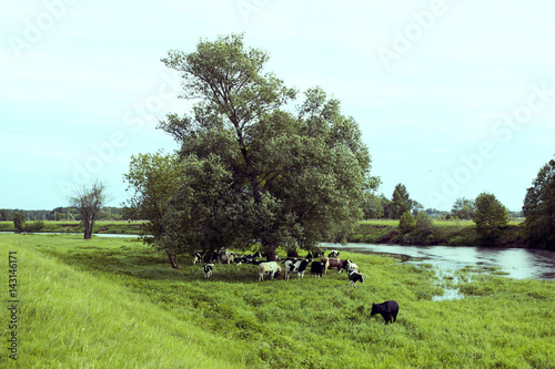 Grazing cows on a riverbank under the big tree. Black and white cows in pasture eating grass and having rest near the river. Retro toned, vintage looking background.