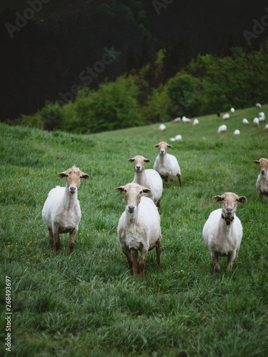 agriculture, animal, background, beautiful, countryside, day, farm, farming, field, 5, foggy, follow, grass, green, group, landscape, farm animal, looking, mammal, meadow, mist, misty, nature, sheep, summer, vertical, white, wool, young, basque country, sheep, curious, friendly, fence, forest, freedom, vegan, animal rights