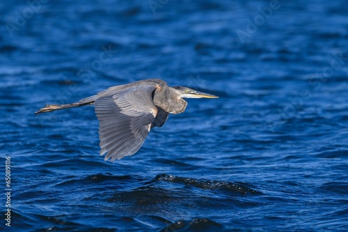 Great blue heron (Ardea herodias) flying over the Connecticut River