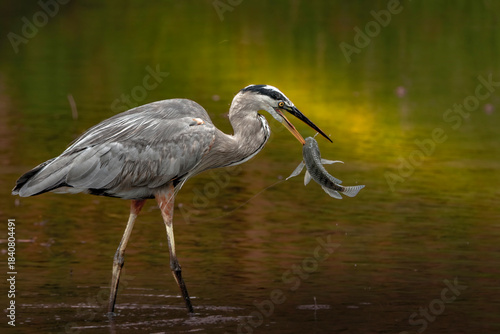 Great blue heron catching fish in shallow water