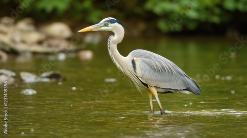 great, blue, heron, bird, wildlife, nature, water bird, avian, animal, fauna, river, rock, green, foliage, vegetation, shallow, water, natural, light, soft, plumage, feather, beak, alert, standing, tranquil, serene, background, blurred, greenery, wild, photo, environment, ecosystem, habitat, kingdom, ornithology, birding, conservation