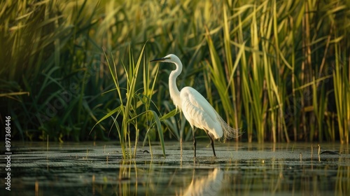 Great egret standing gracefully in a marsh, its white plumage contrasting with the green reeds and water