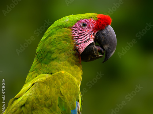 Great Green Macaw closeup portrait on green background