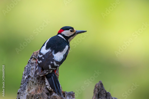 Great spotted woodpecker on a brach in the forest in the Netherlands