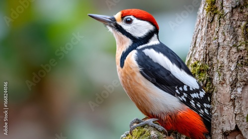 woodpecker, bird, nature, wildlife, forest, tree, tree branch, moss, perch, avian, ornithology, feather, plumage, beak, eye, animal, wild, colourful, vibrant, red, black, white, orange, brown, green, natural, environment, habitat, watching, looking, observing, closeup, detail, spring