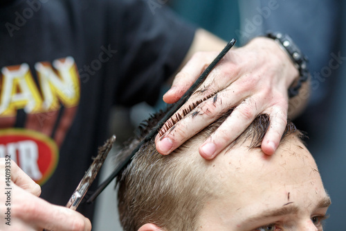 hair, hairdresser, barber, salon, male, coiffure, beauty, care, caucasian, comb, client, people, professional, style, beard, shop, adult, man, occupation, hipster, young, cutting, grooming, indoor, masculinity, person, scissors, skill, 2, casual attire, sitting, bow, brick, brushing, confidence, human, pampering, service, shirt, standing, suspenders, attaching, wall, haircut, hairstylist, barbershop, client, hand, head