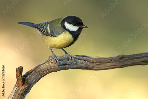Great tit at the first light of an early winter morning in a pine and oak forest