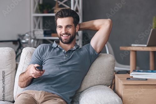 male, man, caucasian, one man only, young adult, watching tv, television, watching, remote control, candid, cheerful, happiness, joy, enjoyment, toothy smile, relaxation, resting, lifestyle, confidence, elegance, casual attire, clothing, people, home interior, comfortable, indoor, sofa, sitting, holding, stubble field