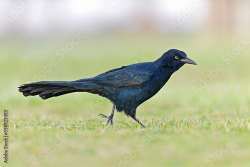 Great-tailed grackle (Quiscalus mexicanus) foraging in a field for insects