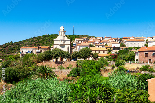Greek church Saint-Spyrido, Cargèse, Corsica, France. Typical and picturesque hillside village. Hilltop town nestled on the coast above the Mediterranean sea.