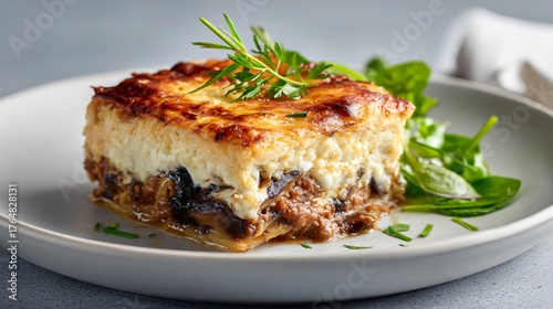 Greek moussaka plated in minimalist Nordic style, clean modern shot