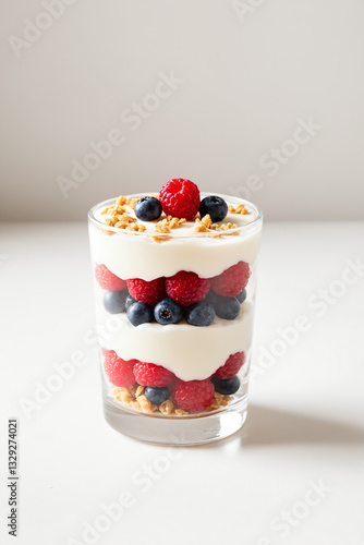 Greek yogurt parfait in glass layered with raspberries, blueberries, granola, and creamy yogurt. Healthy and nutritious breakfast or snack option with fresh ingredients and balanced flavors