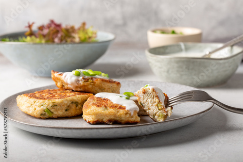 Greek zucchini fritters Kolokithokeftedes on gray background. Zucchini pancakes with feta and herbs, served with greek yogurt.