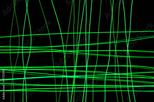 Green abstract background - lines and streaks of light. Blurred, irregular light elements on black background. Green fanciful 3d patterns.