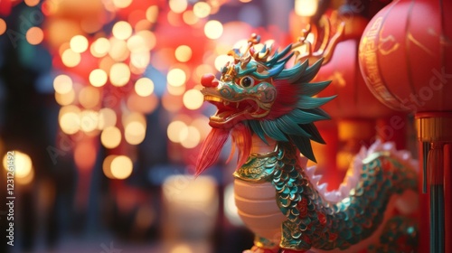 dragon, figurine, lantern, red, gold, green, chinese, new, year, festival, celebration, culture, tradition, mythical, creature, ornament, decoration, holiday, asia, symbol, lucky, good, fortune, wealth, power, strength, wisdom, art, craft, statue, sculpture, closeup, detail, bokeh, light, night, bright, colourful, festive, joyful, vibrant, illuminated, magical, mysterious, beautiful, intricate, texture, background