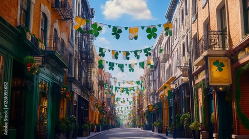 Green and Gold Festive Street with Irish Decorations, St. Patrick’s Day