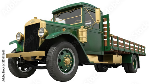 Green and gold vintage truck PNG isolated on transparent background, classic vehicle for transportation and nostalgic designs