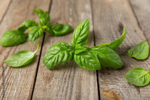 Green basil leaves on a textured wooden background. Kitchen herbs, spices. Fresh green organic basil. Vegan. Greens for salad. Place for text. Copy space.
