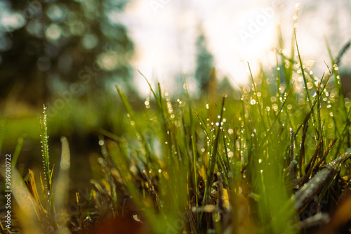 green blades of grass with dewdrops lit by the sun and lying near a frozen pond. Photographed on a cold morning in a beautiful nature reserve