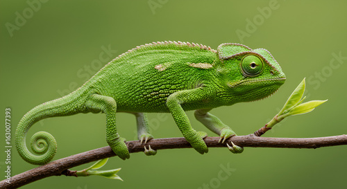 Green chameleon climbing a branch with green background. Detailed skin texture and curled tail clearly visible.