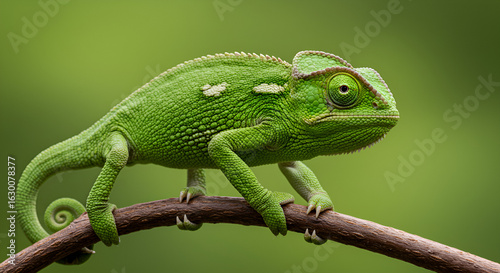 Green chameleon climbing a branch with green background. Detailed skin texture and curled tail clearly visible.
