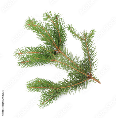 Green Christmas tree branch on white background, top view