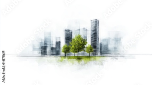city, building, skyscraper, tree, green, urban, watercolor, vignetting, illustration, design, architecture, development, environment, nature, city landscape, modern, grey, white, background, landscape, drawing, abstract, concept, image, graphic, visual, composition, soft, muted, park, growth, future, progress, isolated, copy space, vector