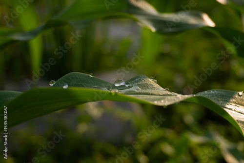 Green corn plant leaf with detailed texture and water droplets reflecting light captured in a lush tropical field perfect for sustainability, freshness, and farming ads.