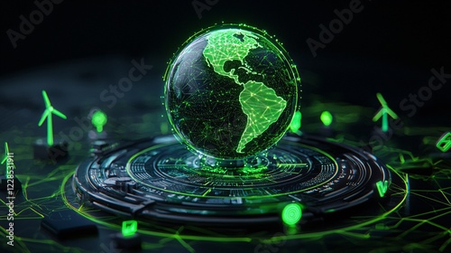 Green Digital Globe with Renewable Energy Icons and Futuristic Design