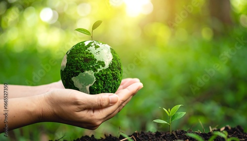 Green earth held gently in hands, surrounded by nature, symbolizing environmental protection and care.