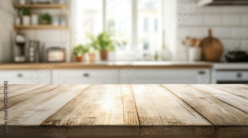 Green Empty wooden table with the bright white interior of the kitchen as a blurred background behind the bokeh golden sunshine