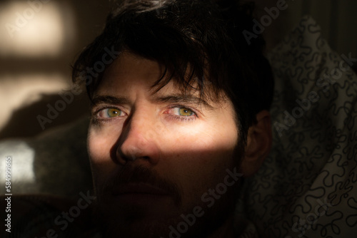 authentic, chill, closeup, couch, eye, face, green, photogenic, hazel, home, indoor, light, living room, look, looking, nose, real, relax, skin, sofa, sunlight