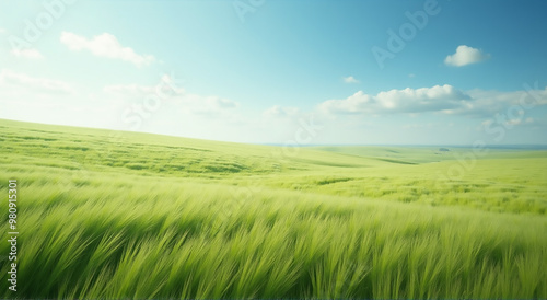 grass, sky, field, landscape, meadow, green, nature, blue, summer, agriculture, cloud, cloud, spring, horizon, sun, day, lawn, land, rural, environment, wheat, countryside, farm, beautiful, country