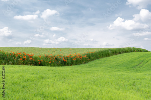 Green field with a hill. Landscape. A wave of plants. Red poppies grow on the border of the fields. Border on the field. Copy space
