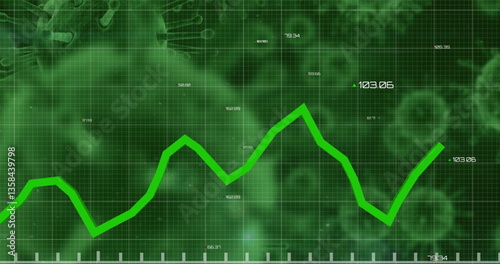 Green financial graph rising against virus background, indicating economic recovery