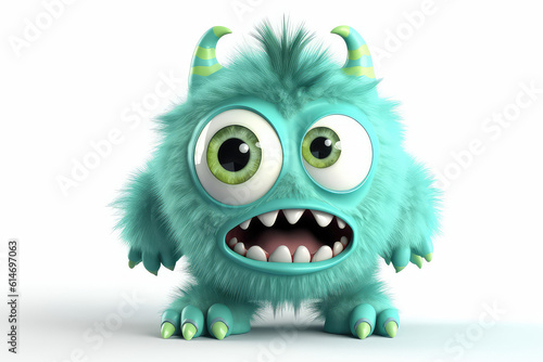 Green fluffy cartoon character monster isolated on white background. Pretty Monster with horns, funny mascot. Generative AI 3d render illustration imitation.