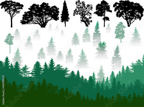 tree, forest, silhouette, illustration, vector, background, isolated, landscape, plant, light, tree branch, land, group, abstract, over