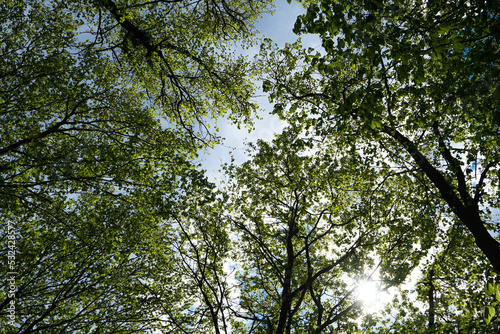 Green Forest. Tree with green leaves and sunlight. Bottom view background. Tall trees.